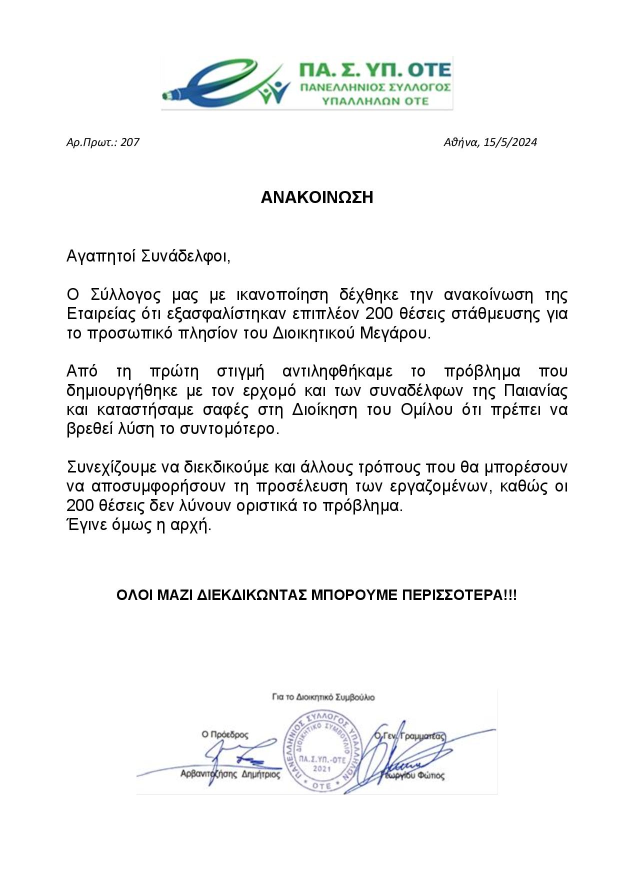 ΑΝΑΚΟΙΝΩΣΗ ΓΙΑ ΘΕΣΕΙΣ ΣΤΑΘΜΕΥΣΗΣ