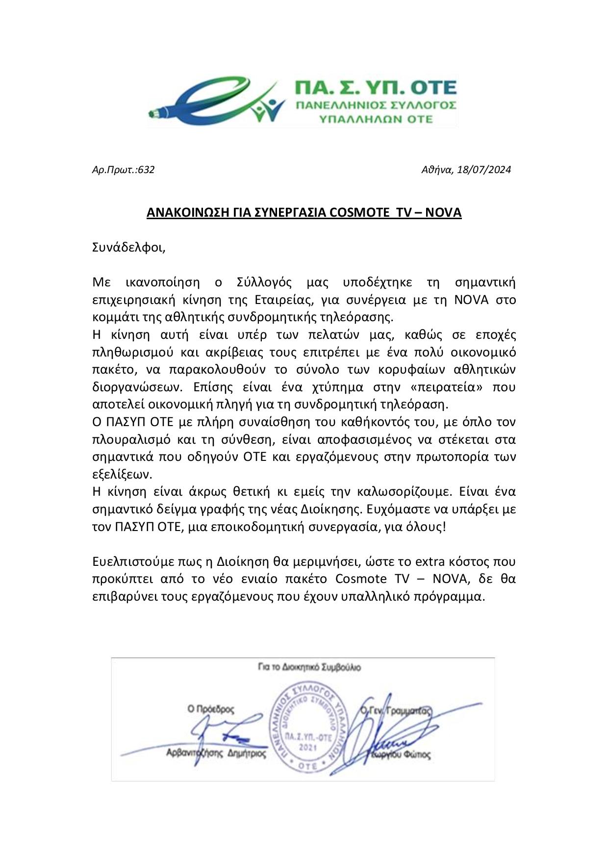 Ανακοίνωση για τη συμφωνία Cosmote TV – Nova