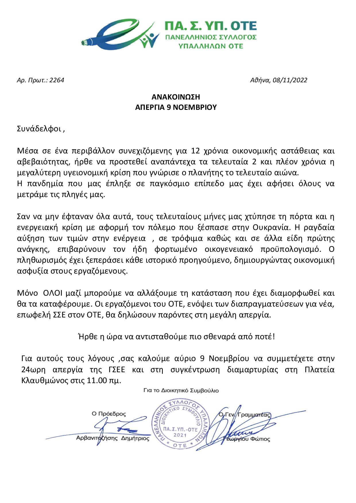 ΑΝΑΚΟΙΝΩΣΗ ΓΙΑ ΤΗΝ ΑΠΕΡΓΙΑ 9-11-2022