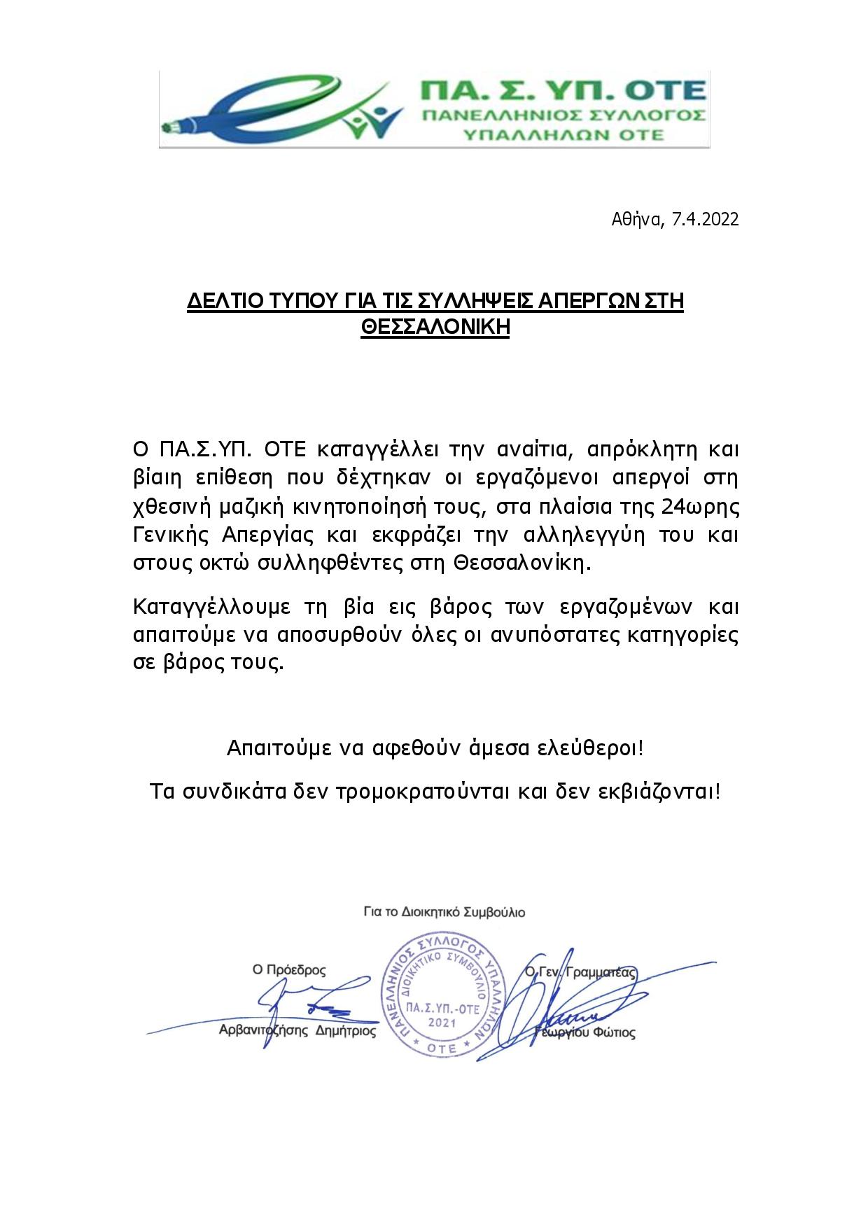 ΔΕΛΤΙΟ ΤΥΠΟΥ ΠΑΣΥΠ-ΟΤΕ ΓΙΑ ΣΥΛΛΗΨΕΙΣ ΣΤΗ ΘΕΣΣΑΛΟΝΙΚΗ