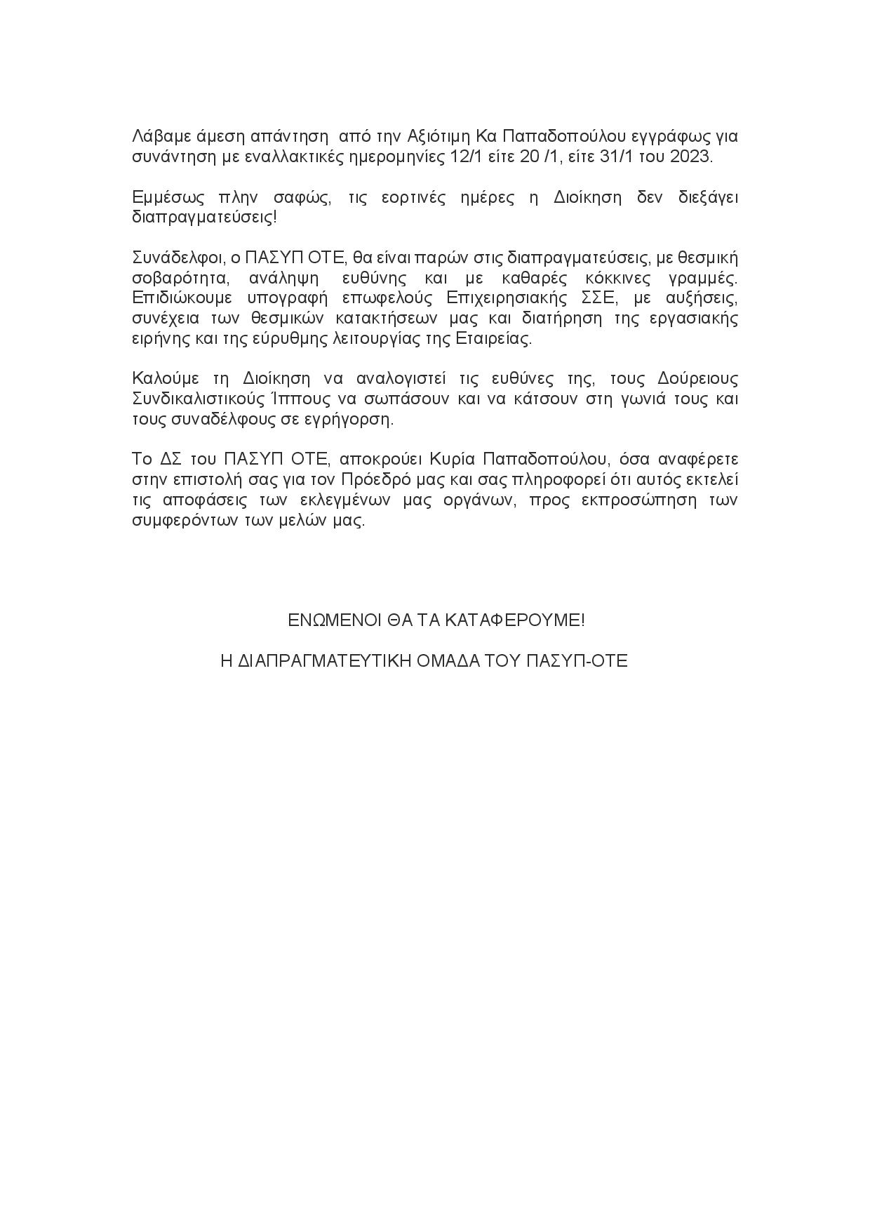 Επιστολή Απάντηση προς τη Διοίκηση