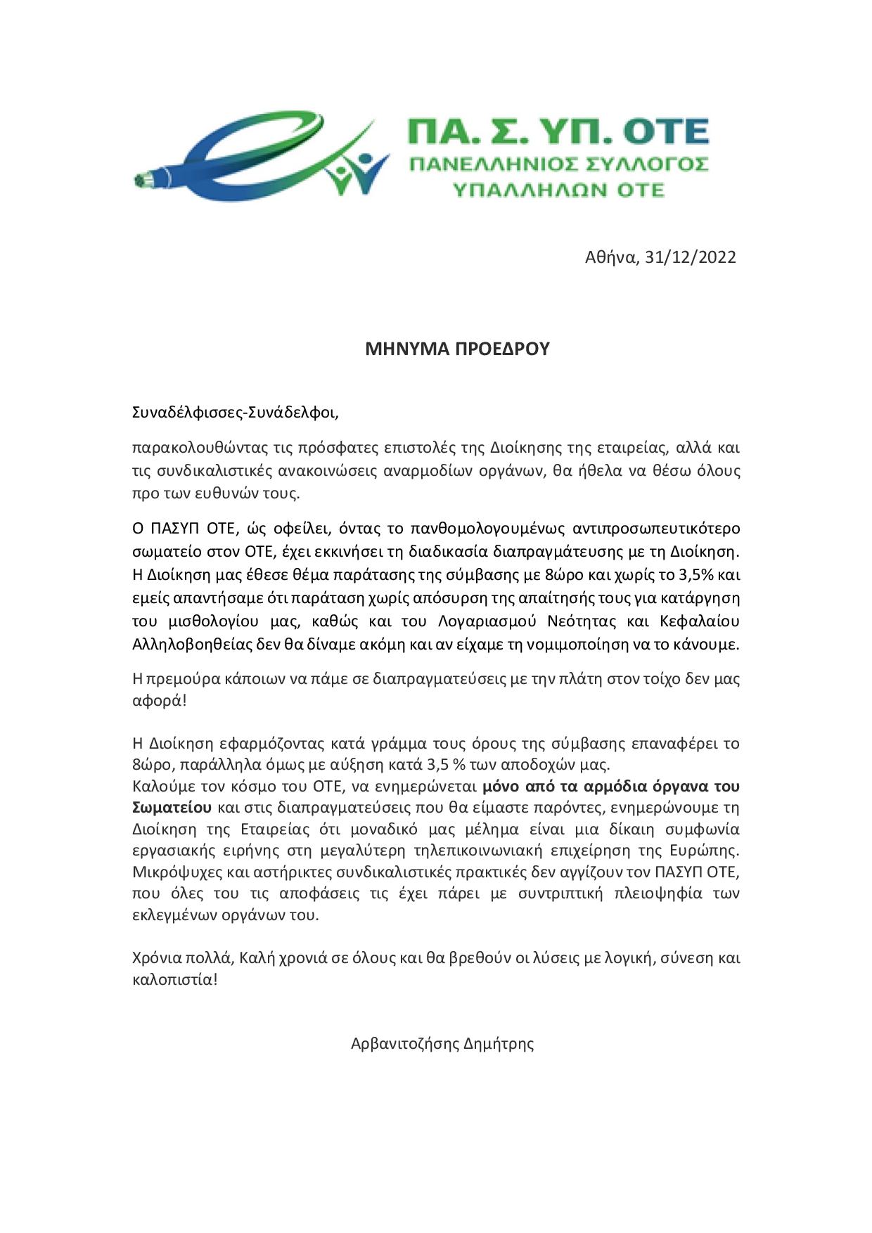 ΜΗΝΥΜΑ ΠΡΟΕΔΡΟΥ ΠΑΣΥΠ ΟΤΕ